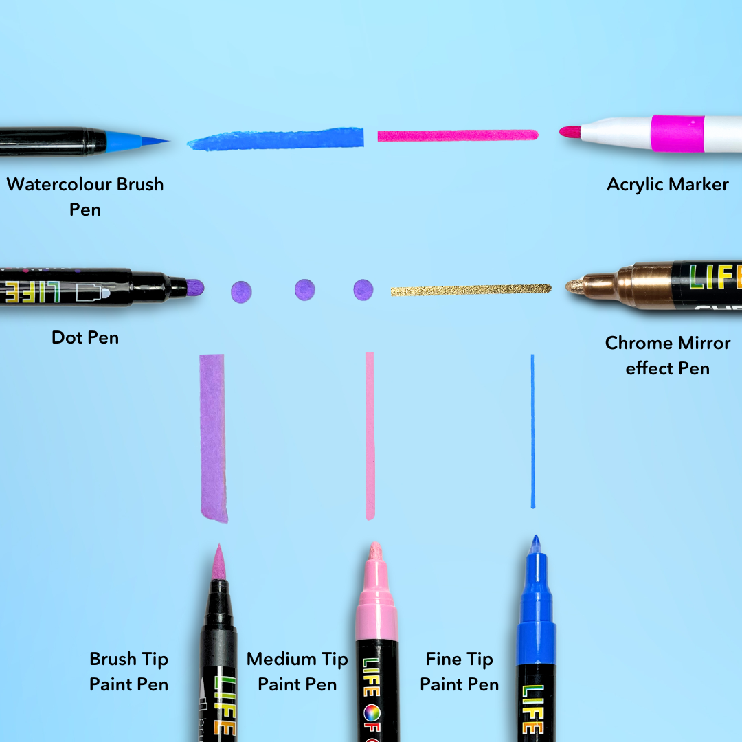 We recommend using the 1mm fine tips or dot pens for detailing and very fine lines. Dot pens are for making perfect dots. Please note that fine tip pens will splatter on rough surfaces. Brush pens, Acrylic markers and Medium tip (3mm) pens are best for drawing, colouring in, and filling in backgrounds.