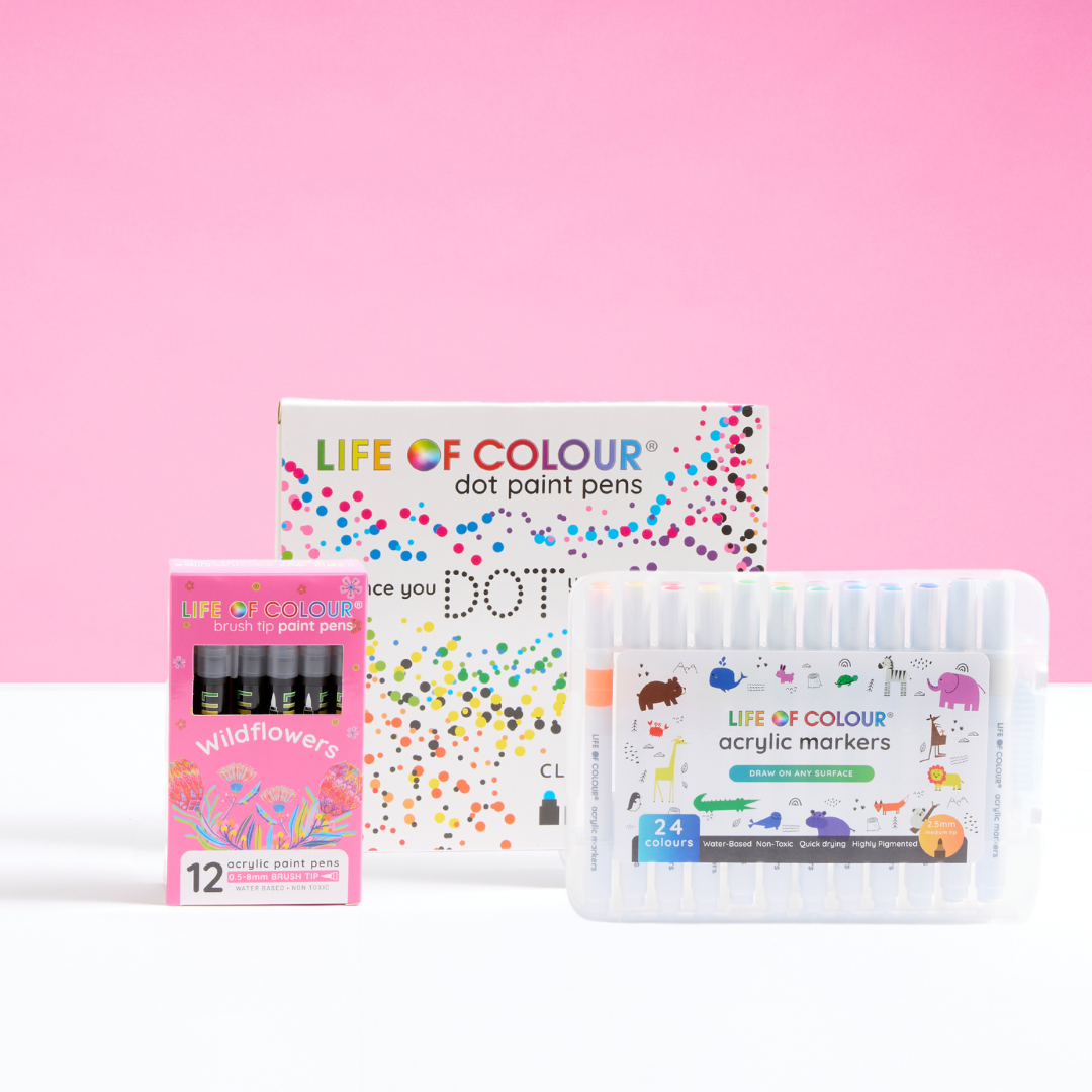[{"id":159413502037,"handle":"acrylic-paint-pens-australia","title":"Acrylic Paint Pens and Bundles","updated_at":"2025-12-14T23:03:40+11:00","body_html":"\u003cp\u003e\u003cspan\u003eAcrylic paint pens are \u003cstrong\u003ewater-based art pens filled with acrylic paint, for use on any surface\u003c\/strong\u003e: fabric, textile, canvas, metal, pottery, treated wood, plastic, stone, terra-cotta, polymer clay, rock \u0026amp; more. Our acrylic paint markers are resistant to water, fading, abrasion and quick drying.\u003c\/span\u003e\u003c\/p\u003e\n\u003cp\u003eWe have a growing collection of paint pens, including our Classics, Special Colours, Fluro, Earth Colours, Glitters and Metallics!\u003cspan\u003e \u003cstrong\u003eB\u003c\/strong\u003e\u003c\/span\u003e\u003cstrong\u003erowse the entire paint pen catalogue here.\u003c\/strong\u003e\u003c\/p\u003e\n\u003cp\u003eWe know it's really hard to choose, so we have come up with \u003ca href=\"https:\/\/www.lifeofcolourproducts.com\/collections\/stencils-and-bundles\" target=\"_blank\"\u003eDISCOUNTED BUNDLES\u003c\/a\u003e that help you save money and also make the choice easier, you can get started with the double bundle or work your way from the top with the Full Monty (6 boxes). \u003c\/p\u003e","published_at":"2020-02-11T00:22:28+11:00","sort_order":"best-selling","template_suffix":"","disjunctive":false,"rules":[{"column":"title","relation":"contains","condition":"paint pens"}],"published_scope":"global"},{"id":417827291354,"handle":"afterpay-day-sale","updated_at":"2025-12-14T23:03:40+11:00","published_at":"2023-08-14T12:23:47+10:00","sort_order":"manual","template_suffix":"","published_scope":"global","title":"Afterpay Day Sale","body_html":"","image":{"created_at":"2023-08-15T15:35:25+10:00","alt":null,"width":1200,"height":450,"src":"\/\/www.lifeofcolourproducts.com\/cdn\/shop\/collections\/20_OFF-2_1.png?v=1723869514"}},{"id":166905610325,"handle":"all-bundles","title":"All Bundles","updated_at":"2025-12-14T23:03:40+11:00","body_html":"\u003cp\u003eOur discounted pens and accessories bundles help you\u003cspan\u003e \u003c\/span\u003e\u003cstrong\u003esave money and also make the choice easier!\u003c\/strong\u003e \u003c\/p\u003e\n\u003cp\u003e\u003cstrong\u003eMake your own bundle! with any combination of our growing collection of acrylic paint pens, watercolour pens and fabric pens\u003c\/strong\u003e, including our Classics, Special Colours, Fluro, Earth Colours, Glitters and Metallics!\u003c\/p\u003e\n\u003ch3\u003eAcrylic Paint Pens\u003c\/h3\u003e\n\u003cp\u003eOur acrylic paint pens are multi-purpose highly pigmented water-based art pens filled with acrylic paint, for use on any surface.\u003c\/p\u003e\n\u003cp\u003eGet paint pens in Australia and New Zealand in: Classic Colours 1mm and 3mm, Special Colours (pastels) 1mm and 3mm, Fluro, Metallic 1mm, Earth Colours 1.5mm and Glitter 3mm!\u003c\/p\u003e\n\u003cp\u003eEnjoy creating art projects on virtually any surface: fabric, textile, canvas, metal, pottery, treated wood, plastic, stone, terra-cotta, polymer clay, rock \u0026amp; more. Resistant to water, fading, and abrasion\u003cbr\u003e\u003c\/p\u003e\n\u003ch3\u003eWatercolour Brush Pens\u003c\/h3\u003e\n\u003cp\u003e20 vibrant and diverse colours including primary, pastels, fluorescents and naturals (Colours are mixable to create new colours) and a refillable water brush\u003cbr\u003e\u003cbr\u003eRecommended by artists for lettering, calligraphy, drawing, painting and colouring\u003c\/p\u003e\n\u003cp\u003e\u003cspan\u003eGreat for all ages: They are completely mess-free, washable, odourless and non-toxic, making it an amazing gift for creative kids.\u003c\/span\u003e\u003c\/p\u003e\n\u003ch3\u003eColouring Books and Accessories\u003c\/h3\u003e\n\u003cp\u003eBundle our best-selling pens with a range of our accessories to deliver the ultimate mindful gift.\u003c\/p\u003e","published_at":"2020-07-23T08:41:52+10:00","sort_order":"manual","template_suffix":"experiment","disjunctive":true,"rules":[{"column":"tag","relation":"equals","condition":"bundle"}],"published_scope":"global","image":{"created_at":"2020-07-24T01:29:41+10:00","alt":null,"width":1200,"height":450,"src":"\/\/www.lifeofcolourproducts.com\/cdn\/shop\/collections\/BUNDLES-BANNER.jpg?v=1680642427"}},{"id":413827694810,"handle":"all-items","title":"All Items","updated_at":"2025-12-14T23:03:40+11:00","body_html":"","published_at":"2022-11-08T20:30:02+11:00","sort_order":"best-selling","template_suffix":"","disjunctive":false,"rules":[{"column":"variant_price","relation":"greater_than","condition":"0"},{"column":"type","relation":"not_contains","condition":"Gifted"}],"published_scope":"global"},{"id":448361234650,"handle":"all-products-other-than-membership","title":"All Products Other Than Membership","updated_at":"2025-12-14T23:03:40+11:00","body_html":"","published_at":"2025-09-19T03:36:53+10:00","sort_order":"best-selling","template_suffix":"","disjunctive":false,"rules":[{"column":"variant_price","relation":"greater_than","condition":"0"},{"column":"title","relation":"not_contains","condition":"Membership Program"},{"column":"type","relation":"not_contains","condition":"Gifted"}],"published_scope":"global"},{"id":437851128026,"handle":"back-to-school-2025","updated_at":"2025-12-14T23:03:40+11:00","published_at":"2024-12-31T11:26:37+11:00","sort_order":"manual","template_suffix":"","published_scope":"global","title":"Back to School Sale","body_html":""},{"id":90952728661,"handle":"stencils-and-bundles","title":"Bundles","updated_at":"2025-12-14T23:03:40+11:00","body_html":"\u003cp\u003eOur discounted bundles help you \u003cstrong\u003esave money and also make the choice easier\u003c\/strong\u003e, you can get started with the double bundle or work your way from the top with the Full Monty (6 boxes).\u003c\/p\u003e\n\u003cp\u003e\u003cstrong\u003eMake your own bundle! with any combination of our \u003ca href=\"https:\/\/www.lifeofcolourproducts.com\/col