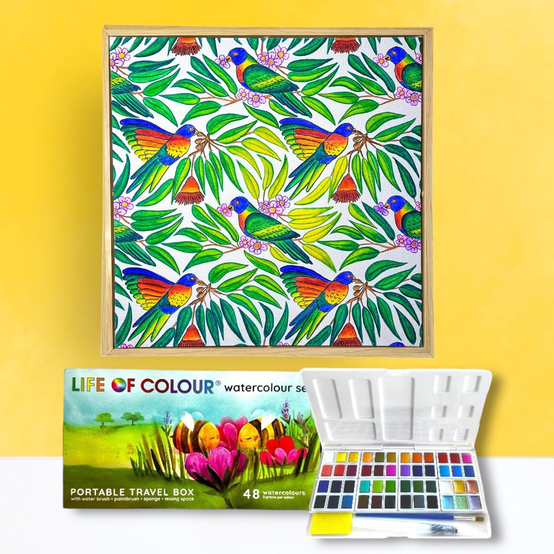 This kit includes a large square-shaped canvas with a beautiful repetitive lorikeet pattern outline, ready for you to bring to life with colour. The light grey outlines make it easy to follow, allowing for a relaxing yet rewarding painting experience. Using our smooth, gliding watercolour brush pens, you can complete a stunning artwork that will add colour to any space. Whether you follow the colouring guide or call on your own creativity, this project will leave you with a vibrant masterpiece ready to hang.