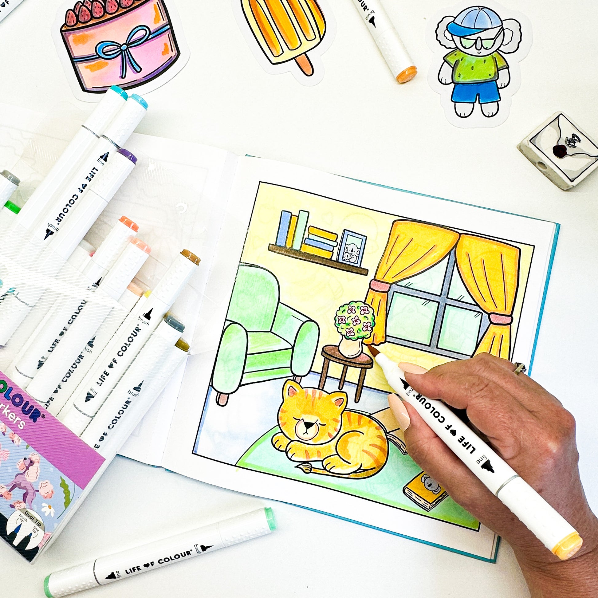 This carefully curated 24-colour selection features soft lilacs, powder pinks, mint greens, buttery yellows, sky blues, and creamy neutrals — perfect for whimsical illustrations, florals, stationery art, or bringing a gentle touch to any creative project. They pair beautifully with our Cute & Cosy Colouring Book and all Life of Colour creative kits.