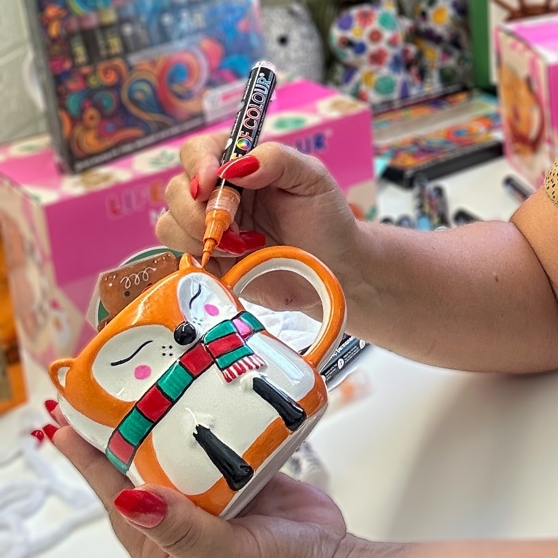 ☕️ 2x Ceramic Mugs – Fox and Gingerbread designs 🎨 Ready to paint straight from the box (no kiln or firing needed) 🖌️ Optional Add on: Perfectly pairs with our PermanentBrush Tip Paint Pens 📘 Step-by-step creative guide and inspiration