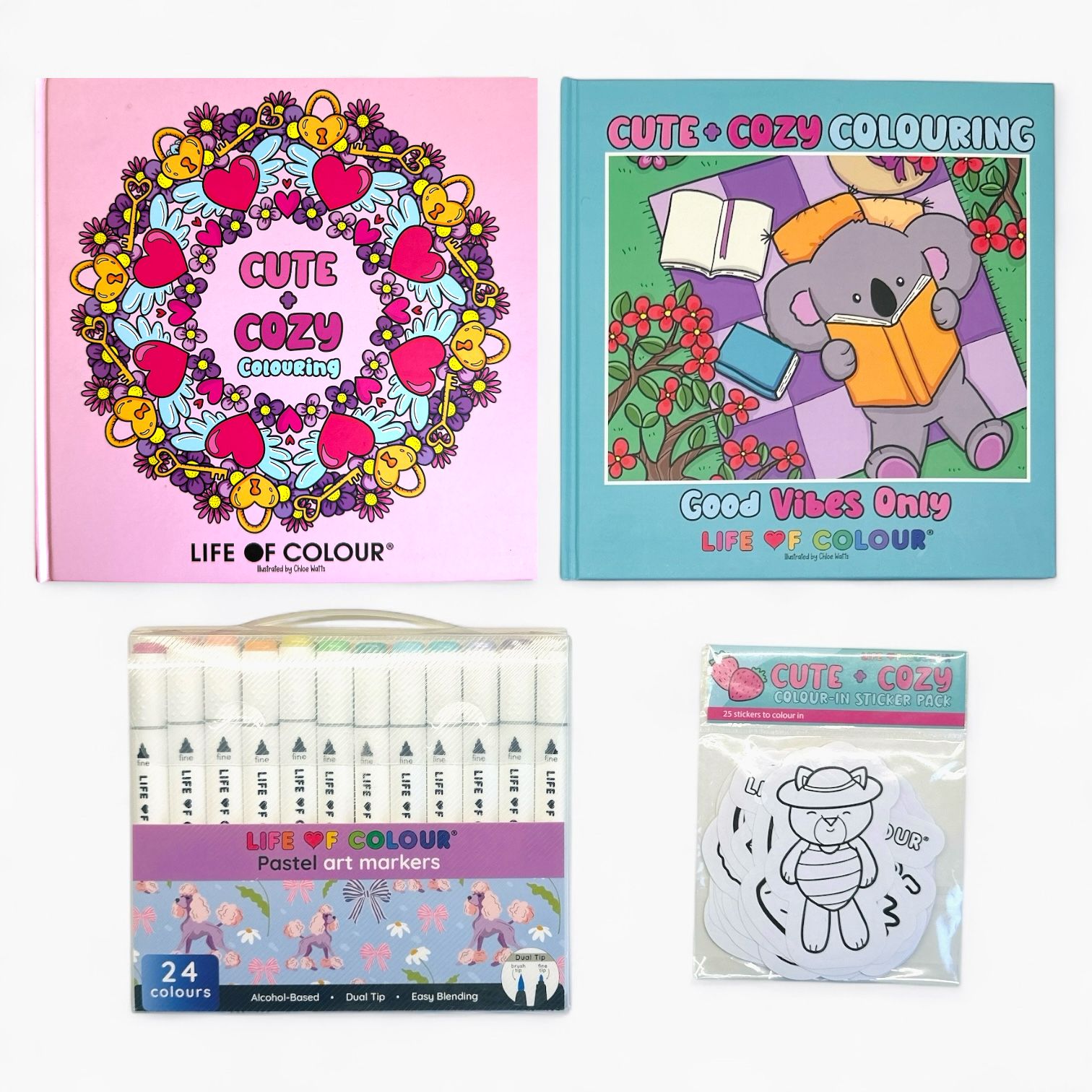 Wrap yourself in creative cosiness with the Cute & Cosy Combo — a perfectly curated bundle designed to bring joy, calm and playful expression to your colouring sessions. Featuring our two bestselling Cute & Cosy colouring books, buttery-smooth pastel markers and matching stickers, this set is all about feel-good fun and charming designs.