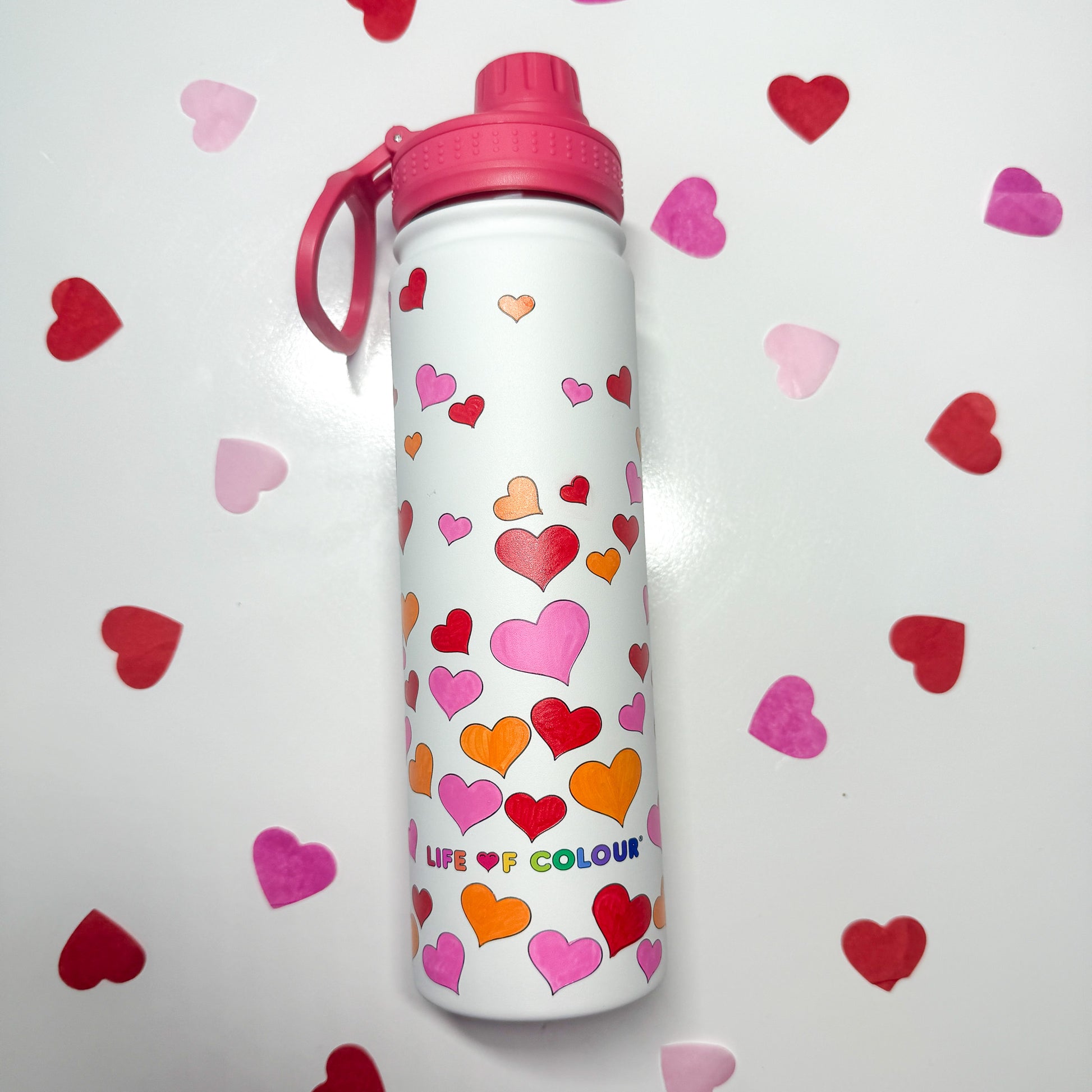 • Powder-coated bottle with printed falling hearts design