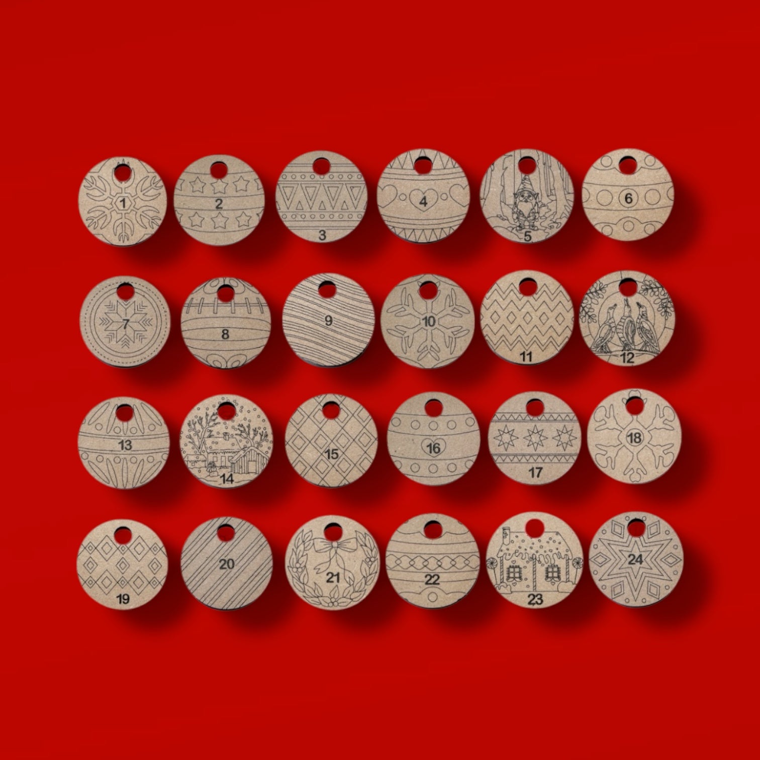 24 round wooden baubles with pre-printed designs, perfect for colouring and decorating - Christmas Tree not included