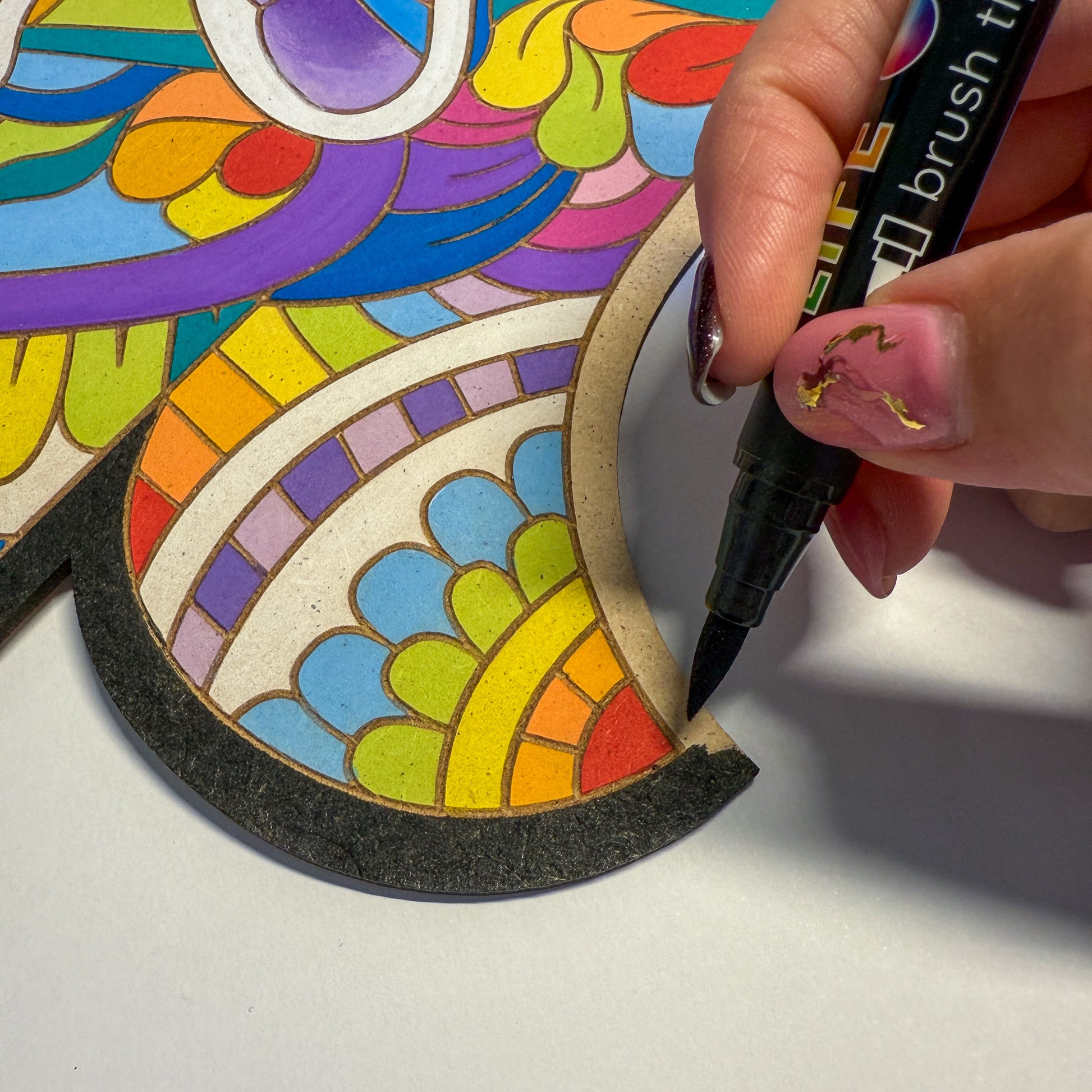 Why You’ll Love It With three boards to explore, you’ll enjoy endless opportunities for mindfulness and creativity. The pens make colouring effortless and relaxing—brush tips for smooth, soothing fills, and dual-tip dots for playful accents and details. Beyond the process, the real joy comes from what you achieve: three beautiful artworks that you can proudly display, either on our mandala stands or as wall décor, filling your home with colour, meaning, and pride in your own creativity.