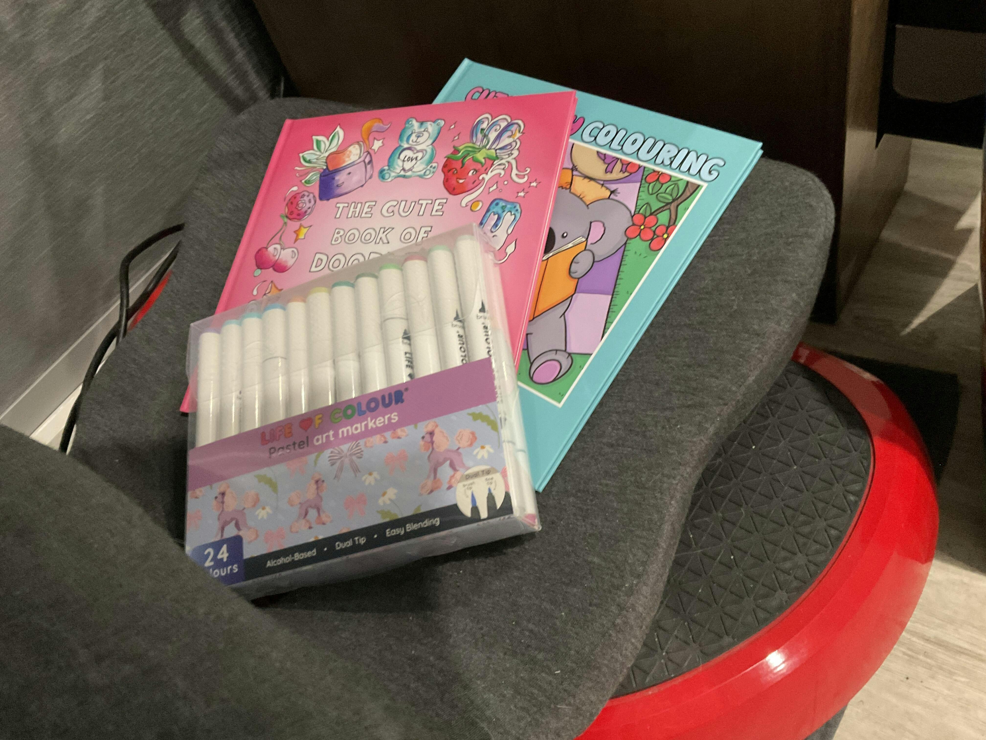 Thank you so much for your positive review! We are thrilled to hear that you enjoyed our Colouring Book Mystery Box and that the alcohol markers were a hit. We are constantly working on creating new sets and we'll definitely take your suggestion into consideration. We apologize for the slight leakage, but we're glad it was easily cleaned up. We'll also make sure to pass along your feedback about more adult designs in our colouring books. Happy colouring!
