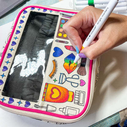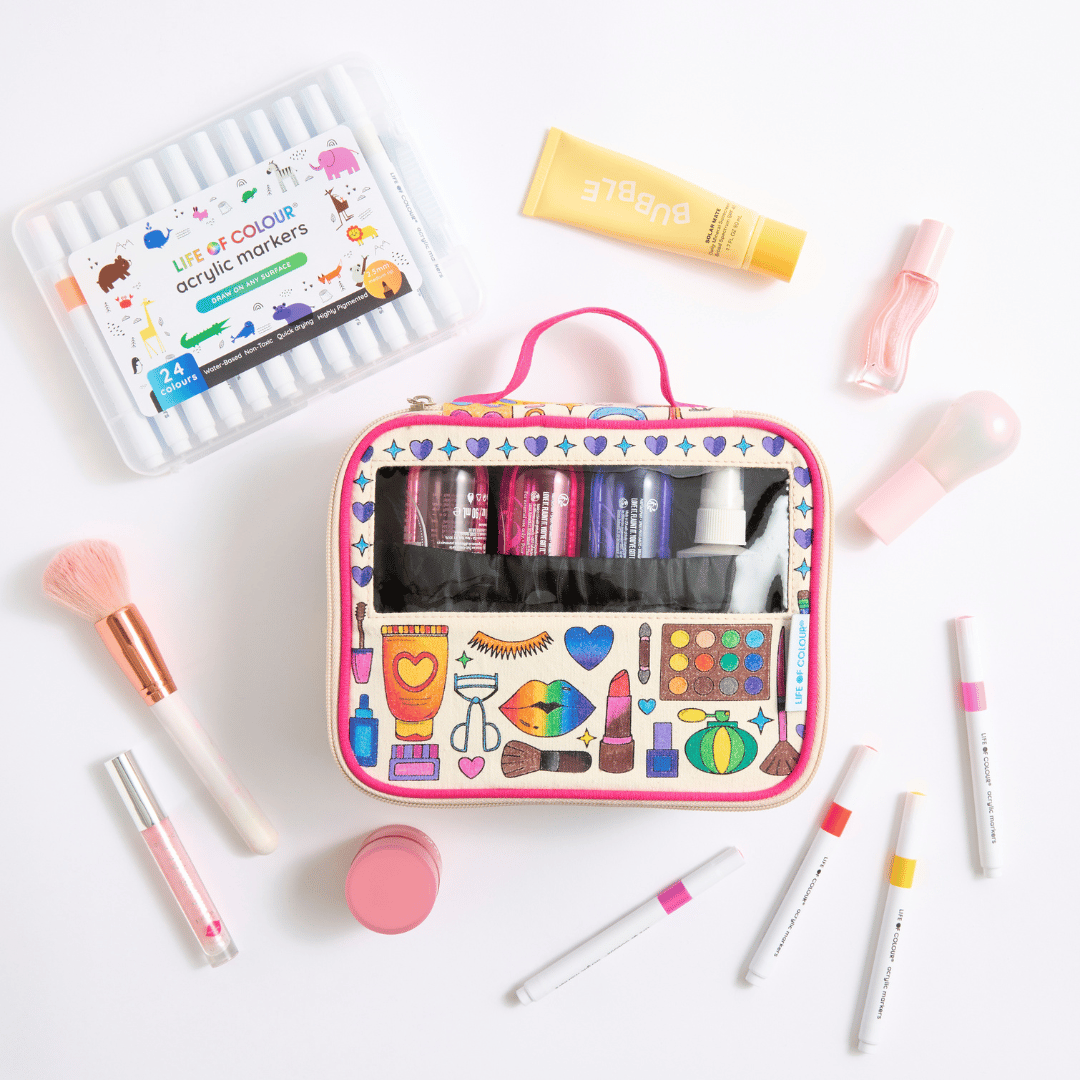 A high-quality DIY beauty bag with beauty-inspired doodles for colouring.