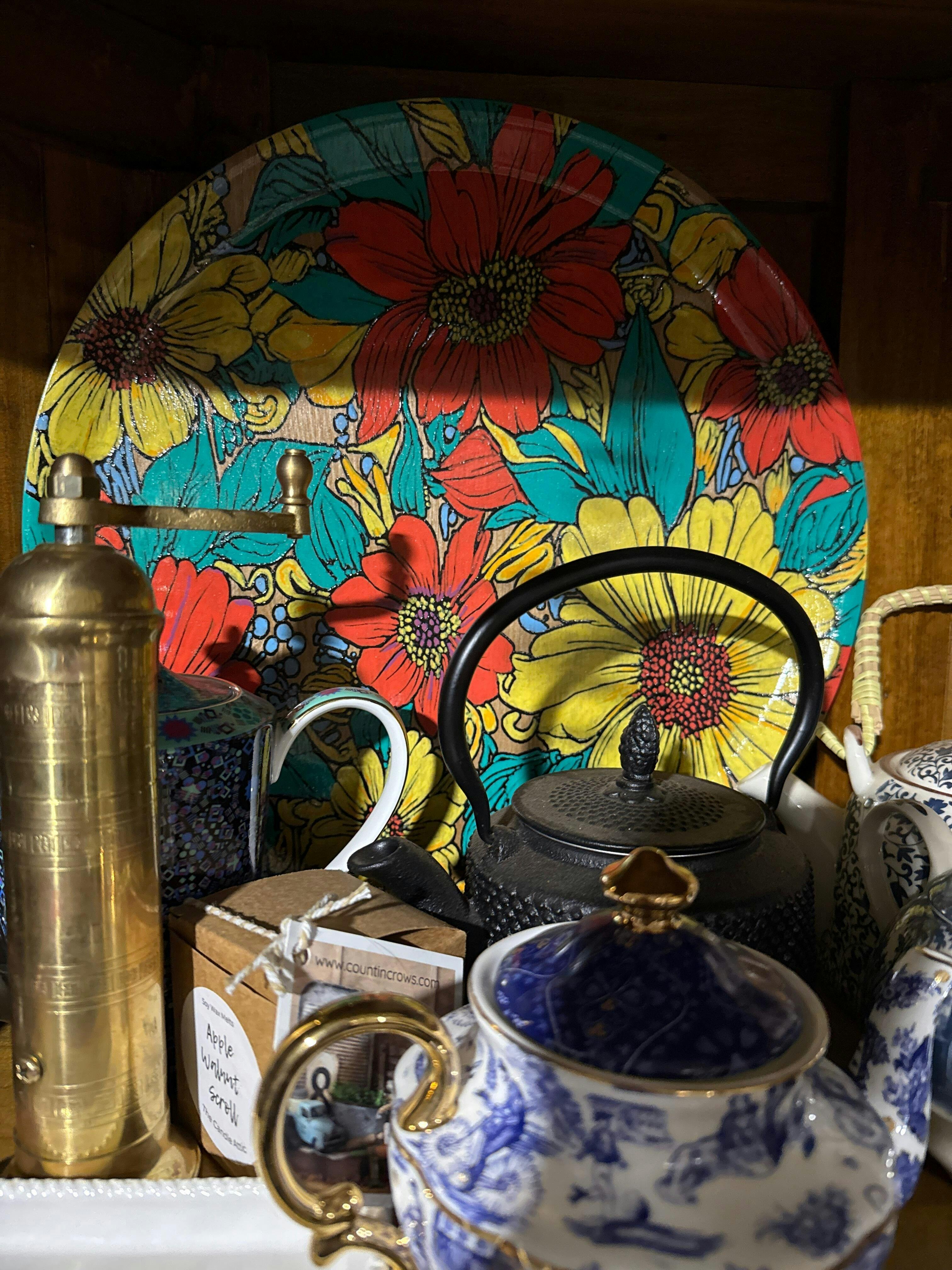 1 x Round Wooden Tray with Peonies Design (32cm, made from willow and poplar wood)