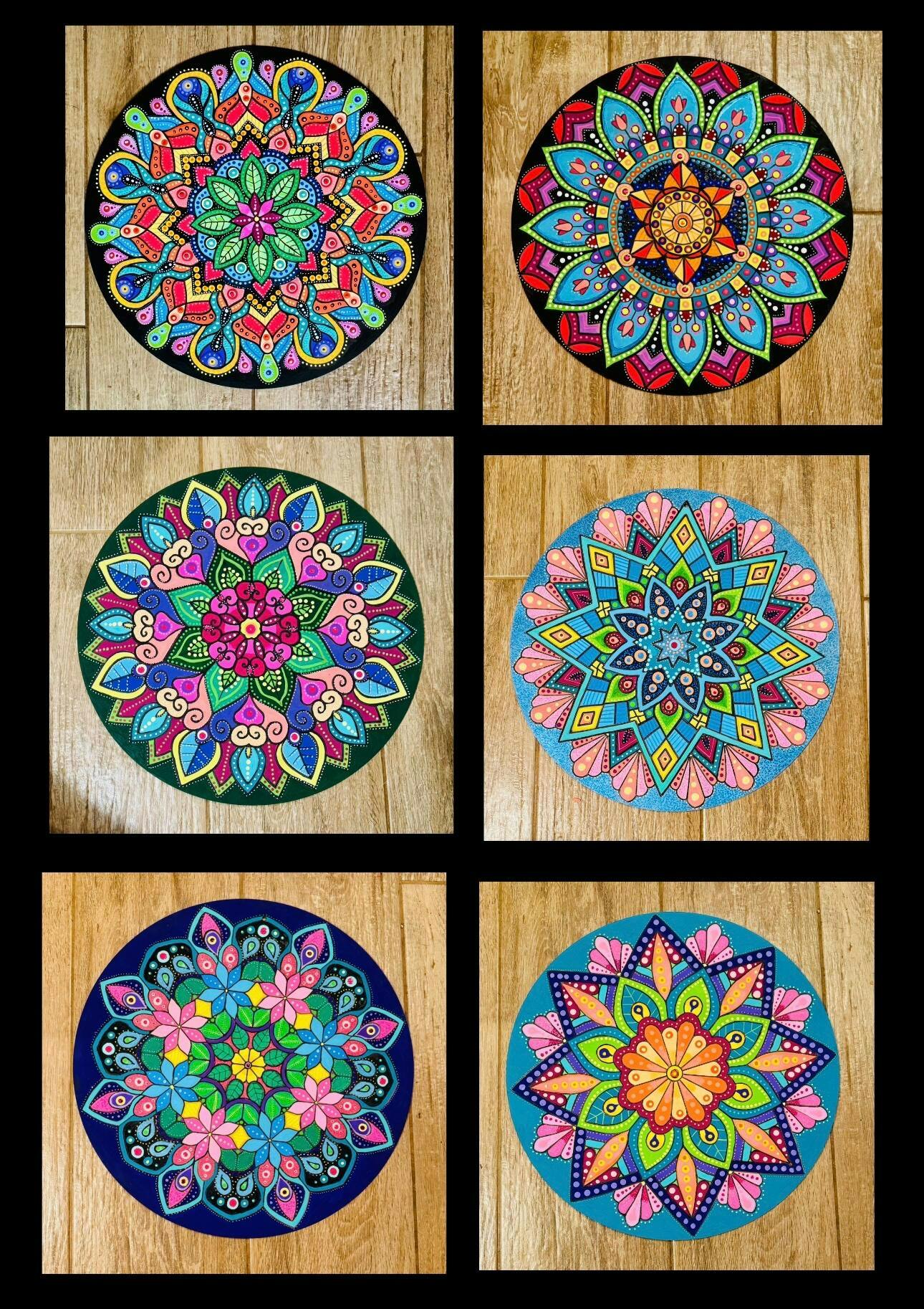 All 6 x 40cm Life of Colour Mandala Boards (Australian MDF) with hanging hole (Kaleidoscope, In Bloom, The Dancer, The Beach, the Phoenix and Botanica)