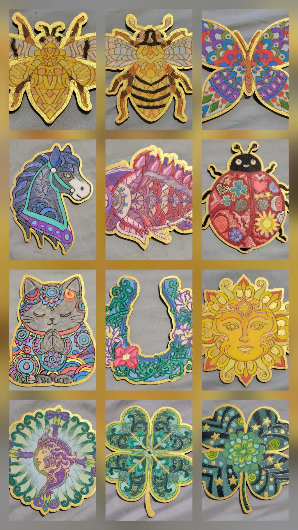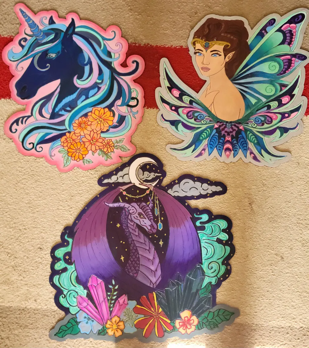 Great products. 3 large boards- dragon ,unicorn and fairy. The beautiful set of lucky charms....3 sets of pens. Beautiful products, excellent price.